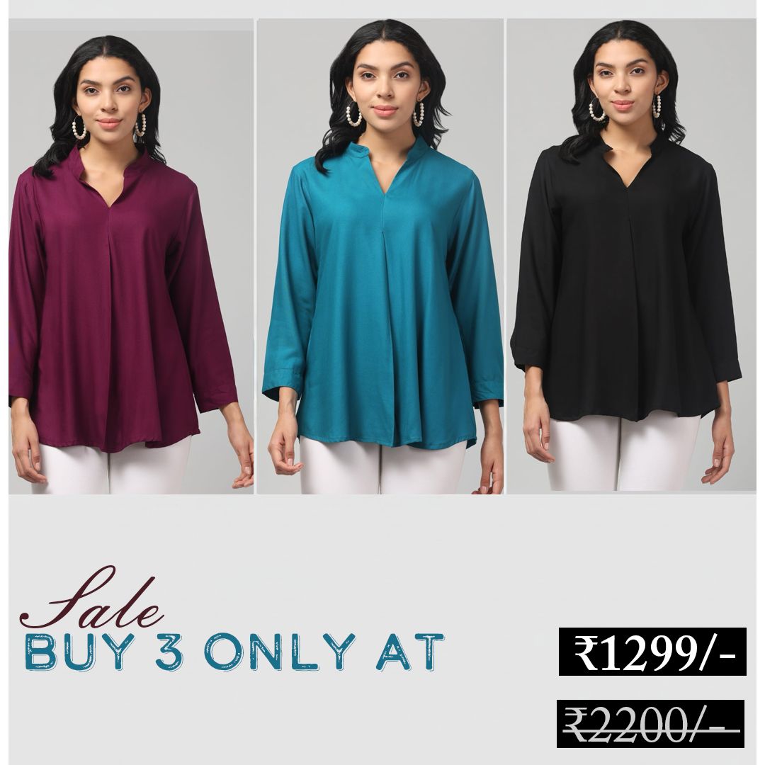 Hosita Brinjal, Ice Blue and Black Rayon Pleated Top