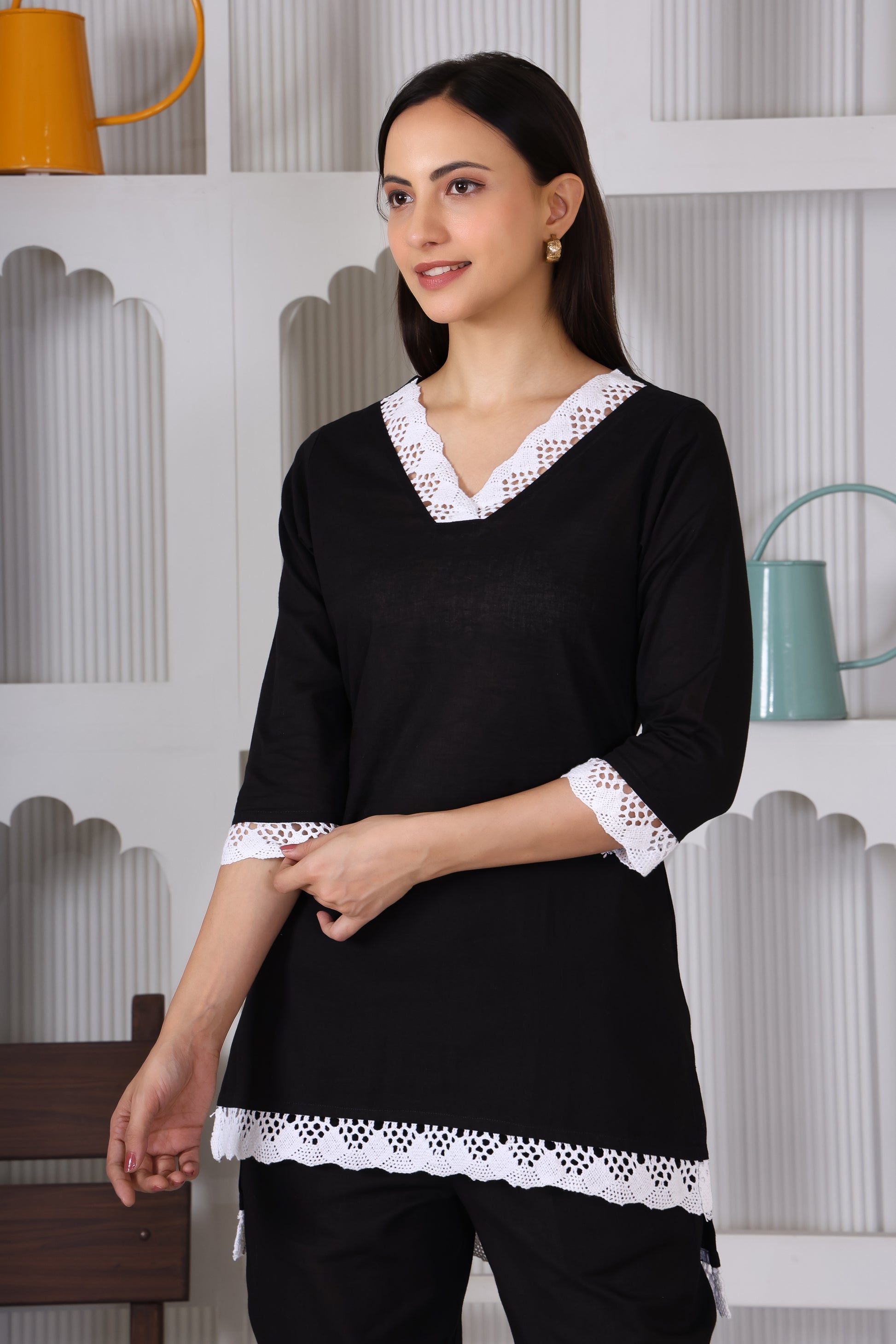 Crafted from breathable, lightweight fabric, this set combines simplicity with Lace Embroidery charm. The 3/4th sleeve top features a V Neck collar, and delicate Lace embroidery on the cuffs, Neck and hemline. It's paired with matching relaxed-fit pants that carry coordinating Lace Embroidery on the Bottom part.
