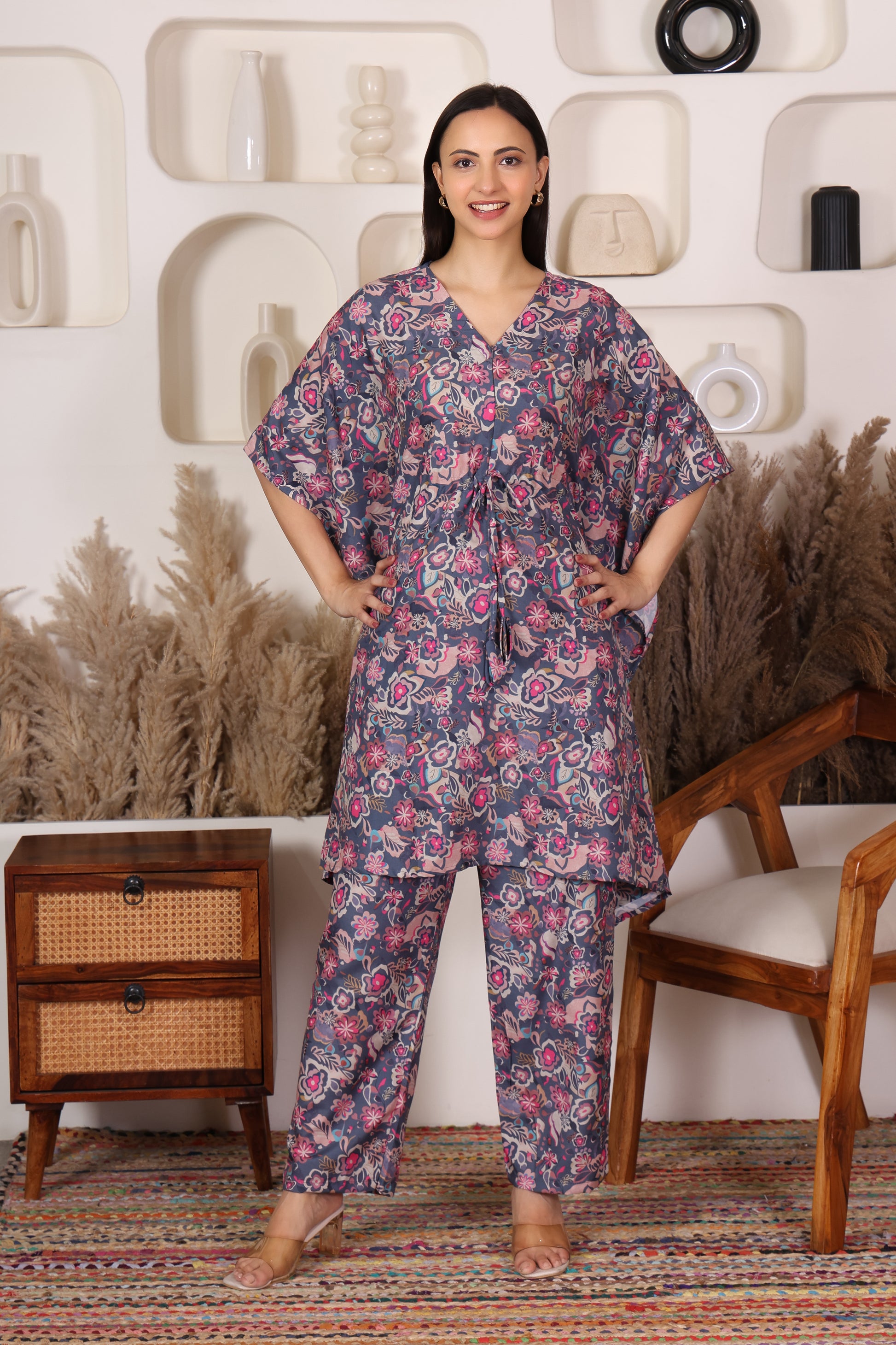 This Hosita Grey Magenta Base Kaftan Co ord Set perfect for fusion clothing with a traditional twist, trendy silhouette and latest styles